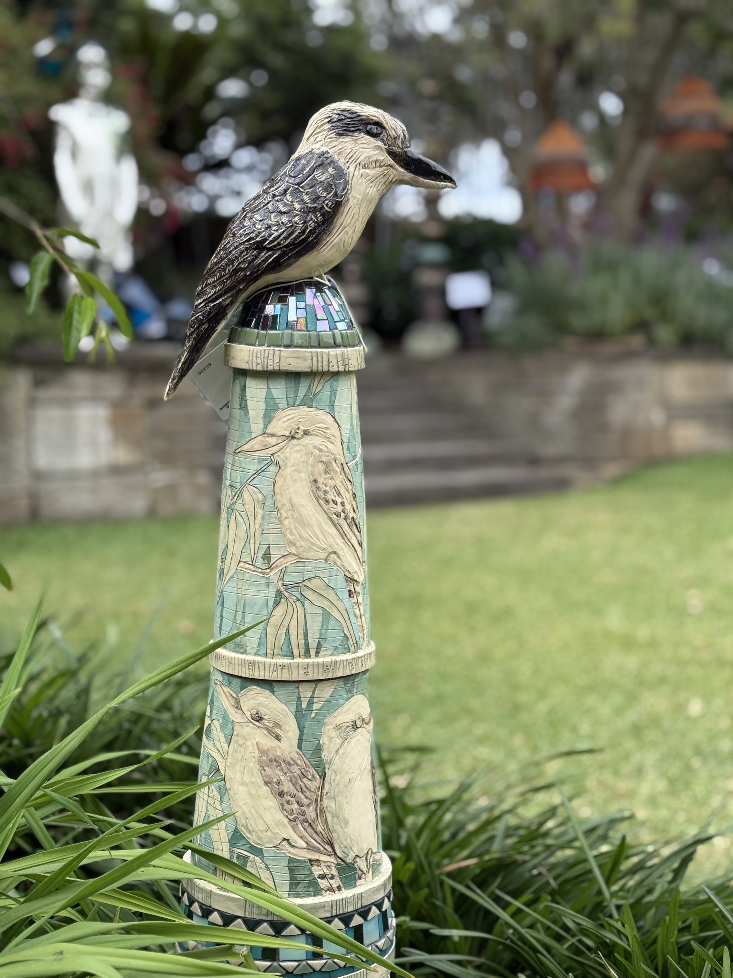My totem sculptures are different. They are bold and designed to make an expressive statement. Each conical form, crowned with a single totem, stands as a quiet yet powerful sentinel among foliage in courtyards and balcony gardens. I enjoy the freedom these simple forms offer โ space to paint, carve and layer marks that together build depth and texture, creating imagery that invites contemplation.