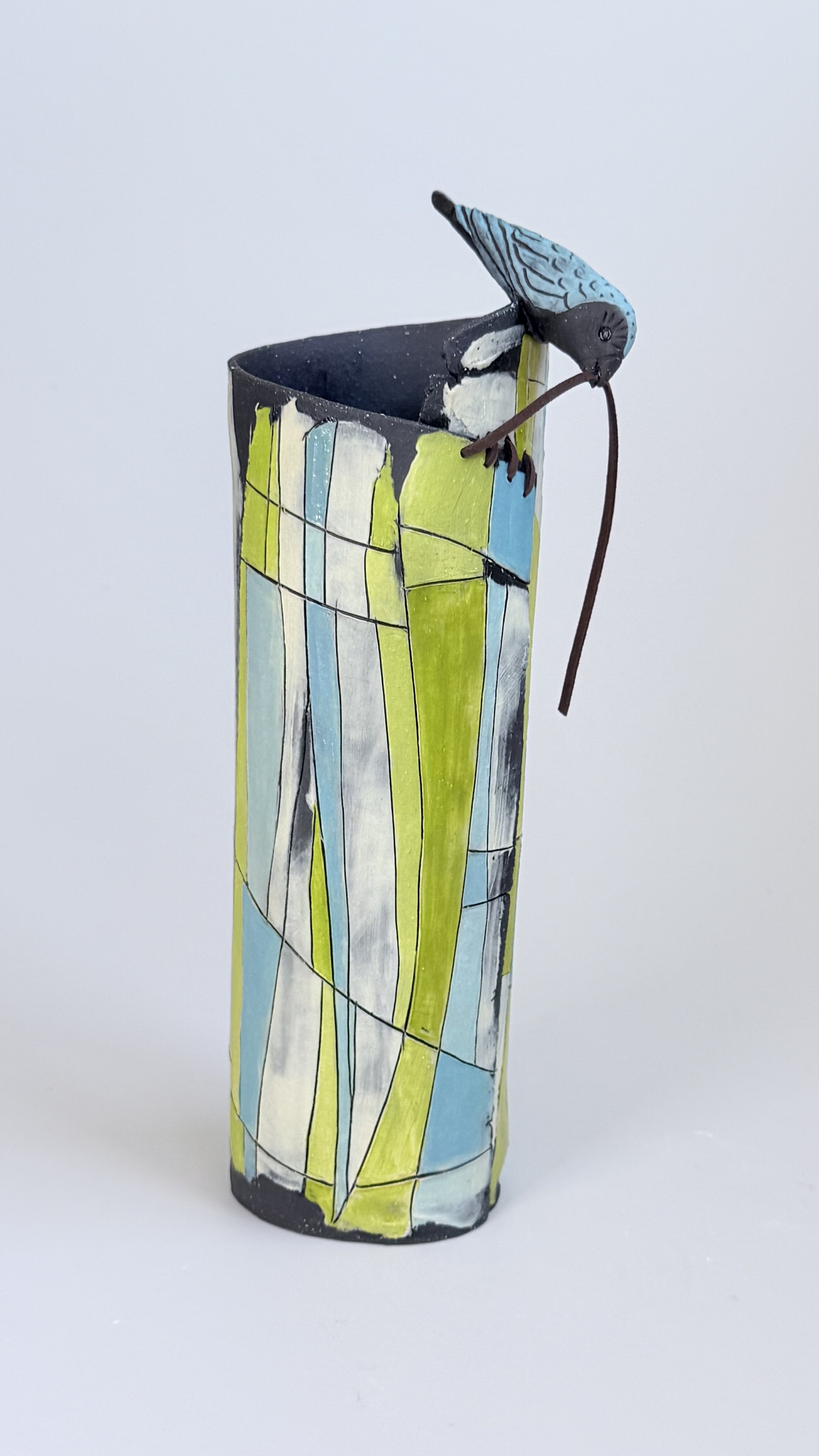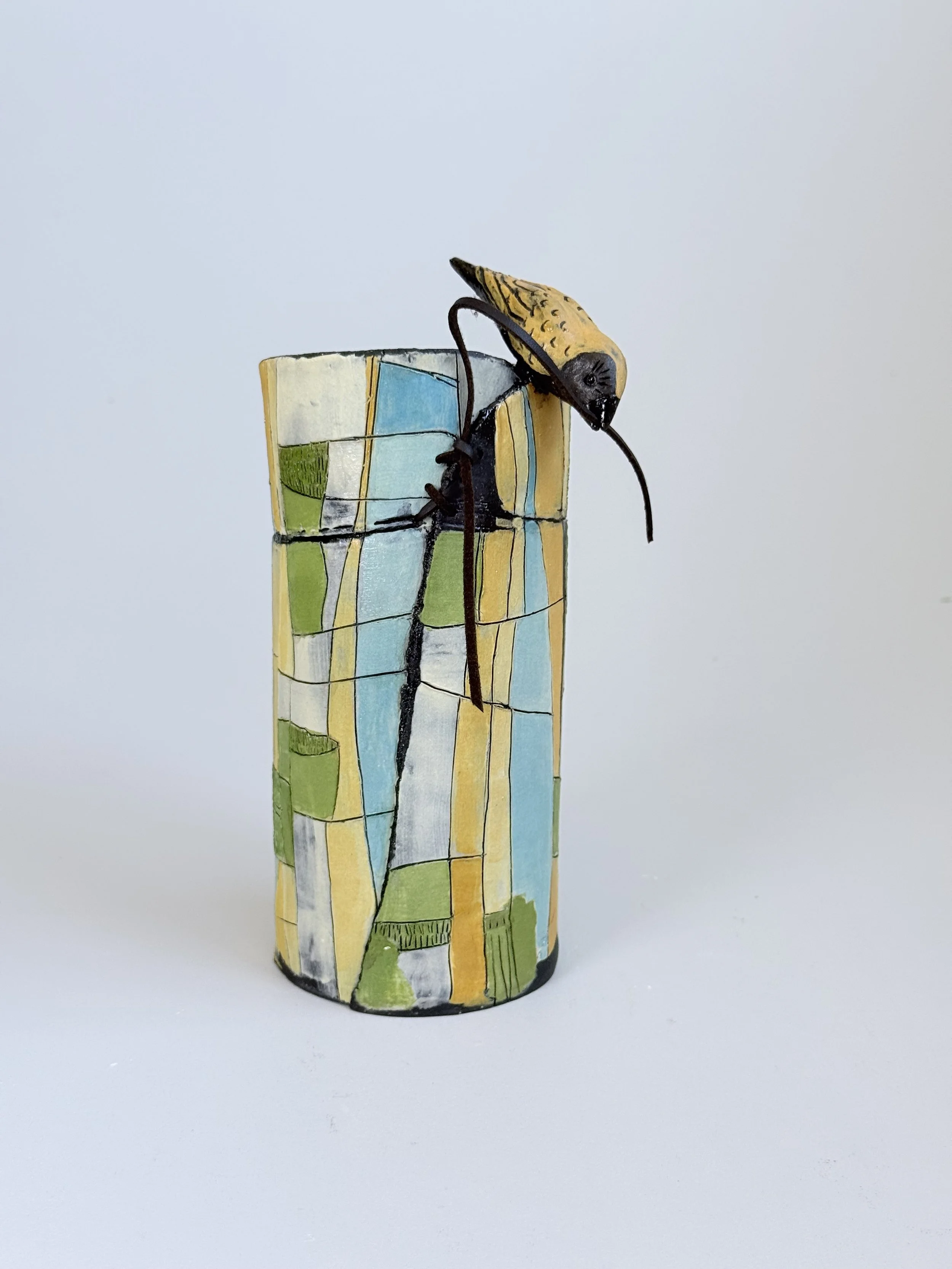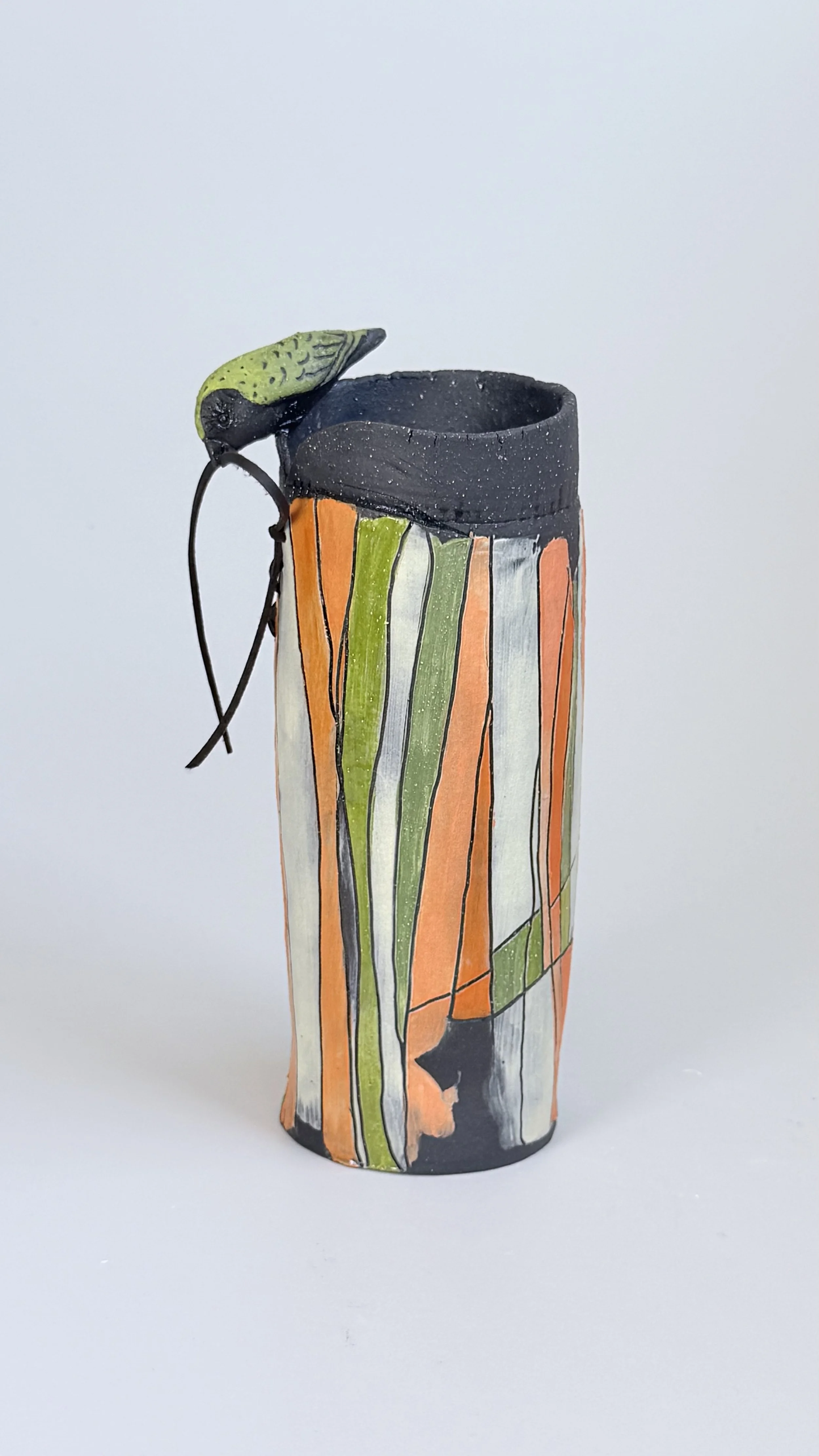 Bushwalks reflects the dense, enveloping calm of time spent walking beneath the canopy. Earthy tones and layered surfaces evoke filtered light, damp air and the slow accumulation of sound and silence. Within the vessel, a finch stitches the opening closed, suggesting protection and repair. The work invites contemplation of deep listening, shelter and the restorative quiet found in sustained attention to place.