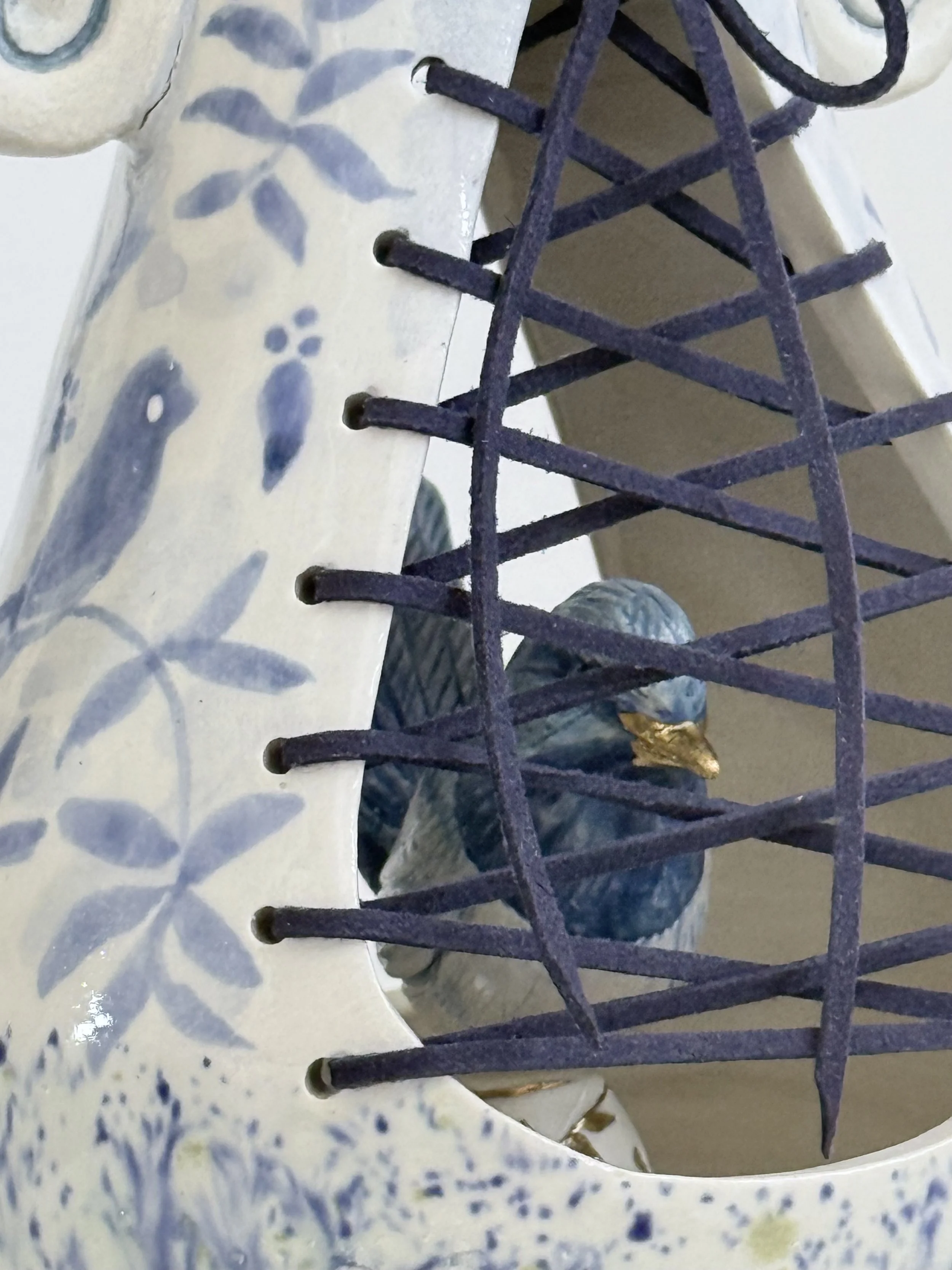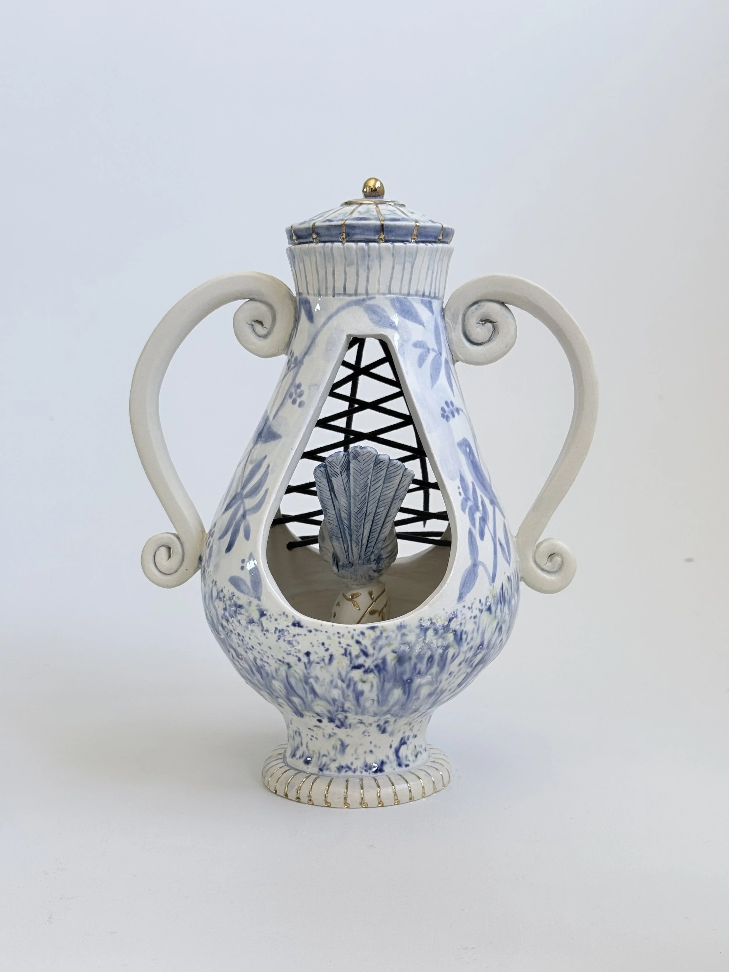 Laced Freedom explores paradoxes of confinement and agency. Hand built from white clay, glazed and adorned with gold lustre and leather cord; the front and back apertures create a visible interior that both conceals and reveals. The leather lacing evokes a corset-like restraint, suggesting self-imposed limits. Inside, a male Superb Fairy Wren – rendered small, delicate and sitting on a gilded plinth – gazes outward as if longing for freedom.