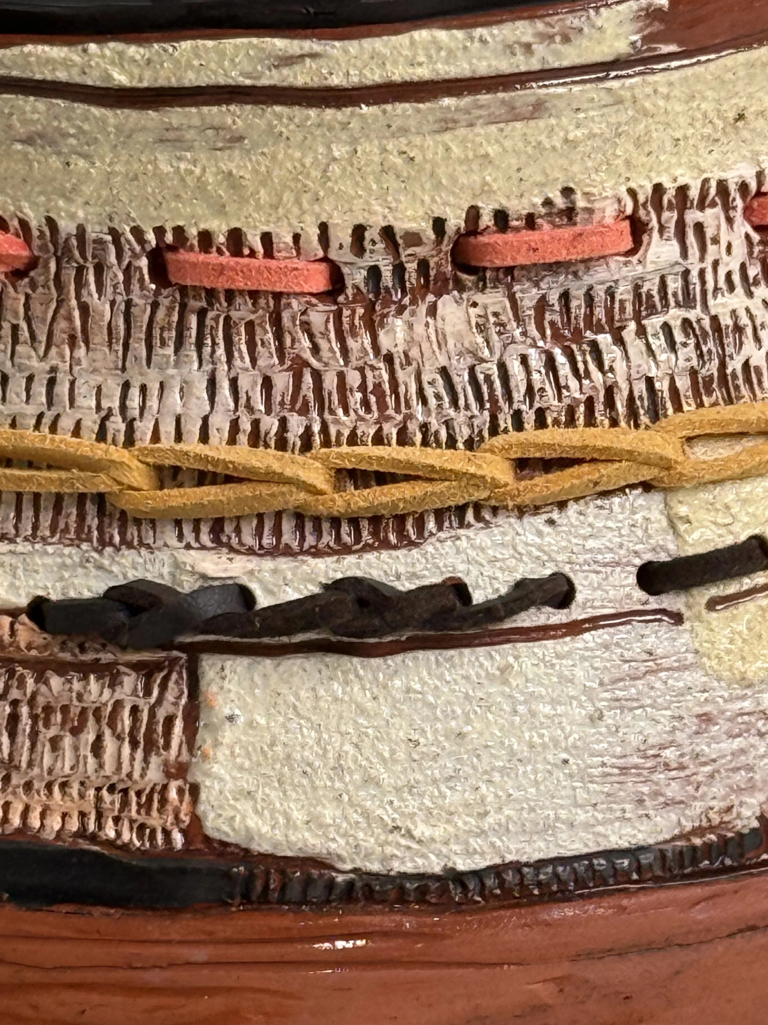 Midfire clay bodies, paperclay slip and suede cord, 2025. 35 × 25cm