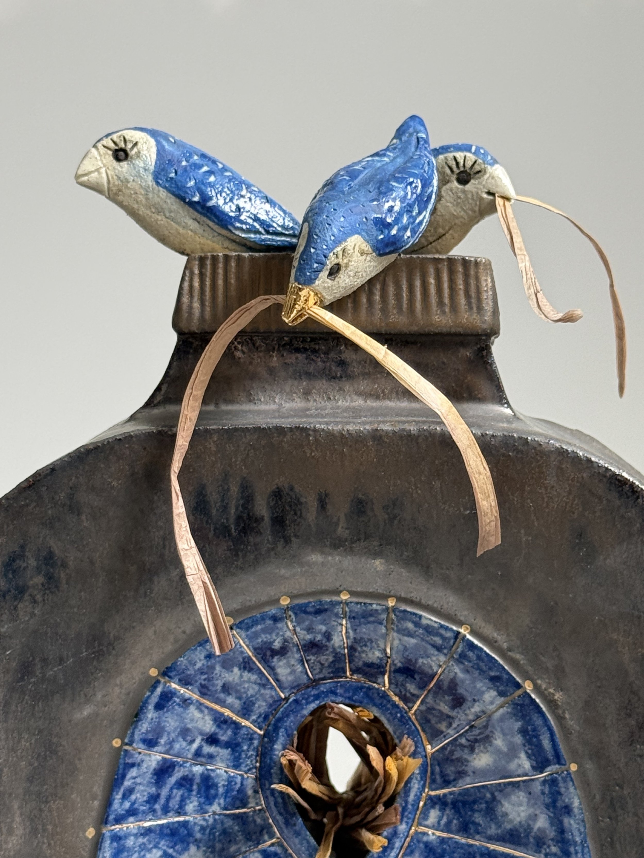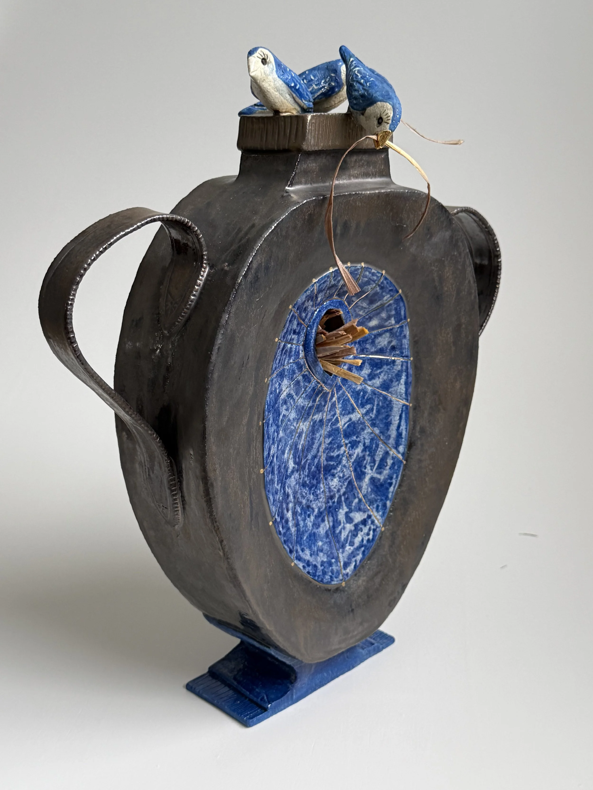 I have taken the language of an ancient vessel and reworked it in contemporary terms: metallic bronze glaze, cobalt blue accents and gold lustre sit alongside the tactile, modest materiality of clay and raffia. The double-sided body and the small shared aperture create two simultaneous views: one side reserved and unadorned, where the nest alone interrupts the surface; the other exuberant with a cobalt field from which radiating gold lines converge toward that same fragile interior. The three finches, busy with pieces of raffia, are the visible labour of making — a quiet choreography of care.