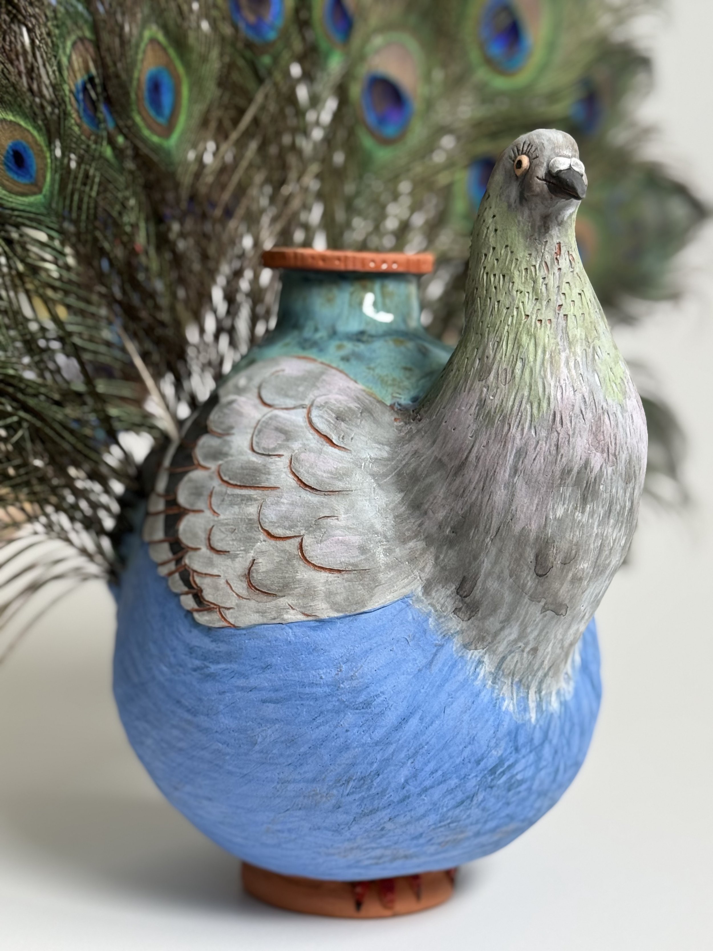 This work explores how identity can expand when we choose to see ourselves differently. A vessel supports a hybrid figure – a pigeon wearing the splendour of a peacock – not to contrast the ordinary and the extraordinary, but to suggest that both live within us at once. The humble pigeon, so often overlooked, steps into the radiance of the peacock, reminding us that dignity and beauty are as much a matter of attitude as appearance.
