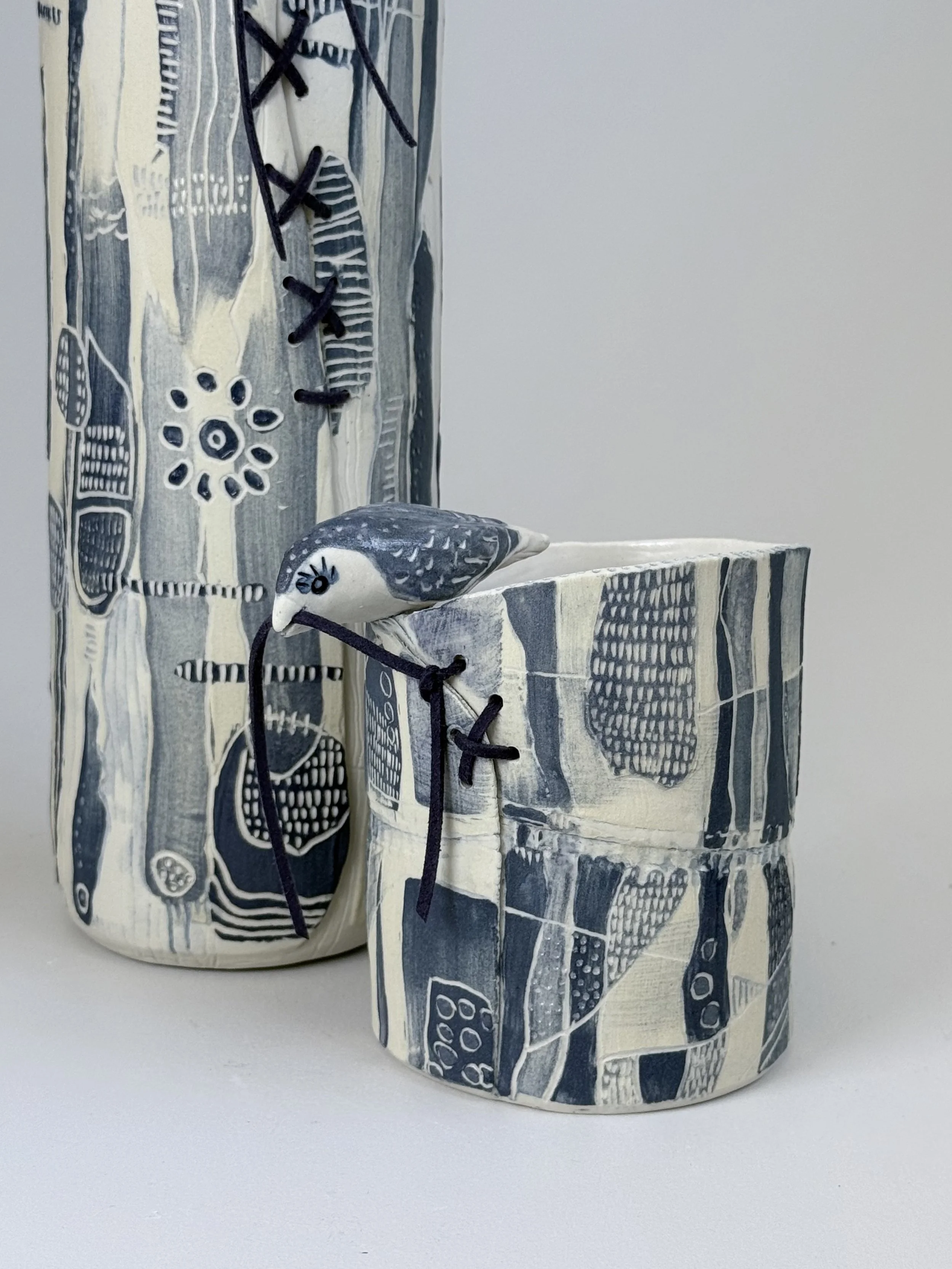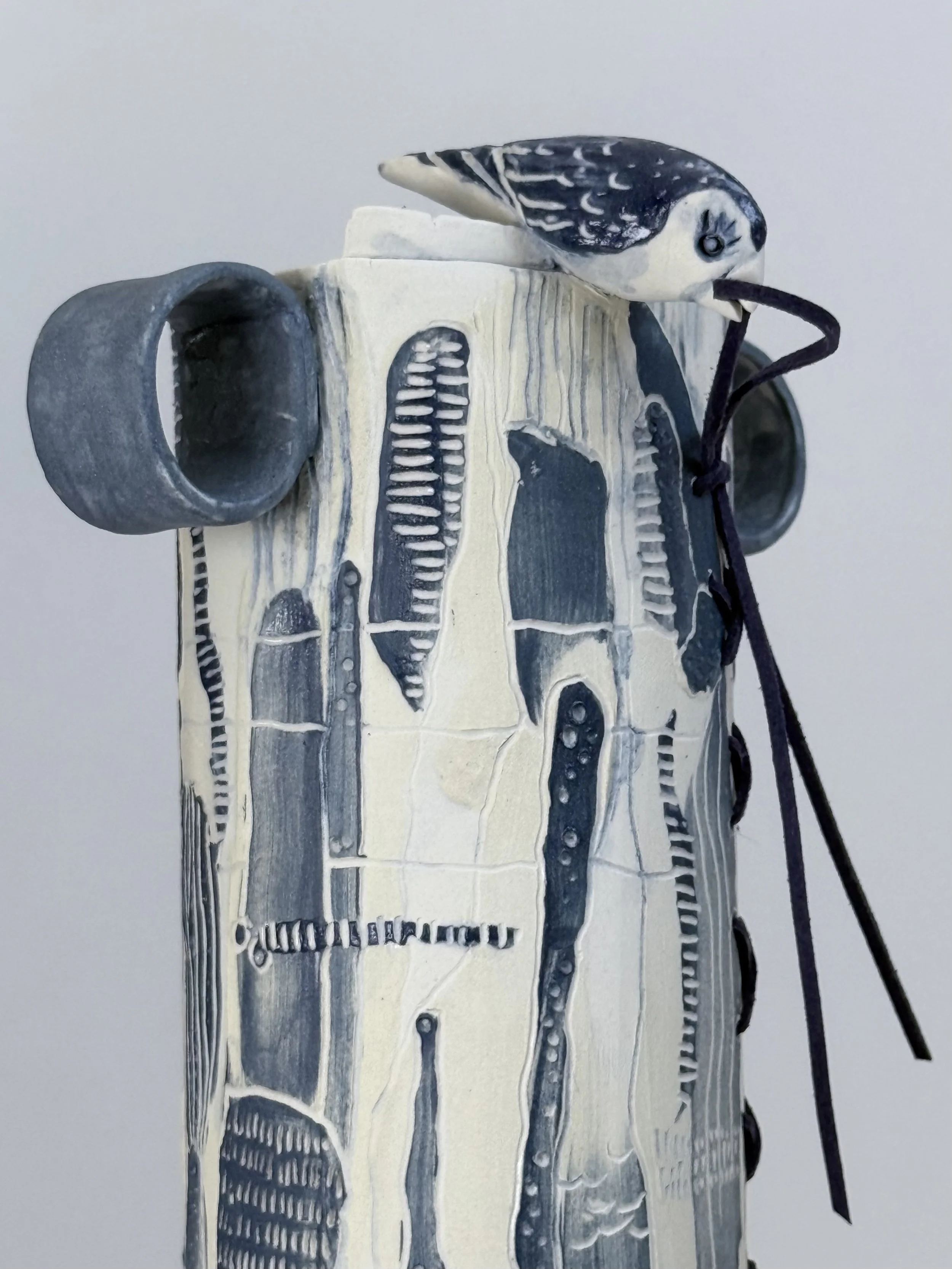 A finch sits on the rim of each vessel, stitching the surface with dark blue leather cord. The stitching is an act of care rather than decoration. It speaks to retrospection as something active: acknowledging breaks, interruptions, and vulnerability, and holding them together rather than hiding them. The past is not restored, but gently carried forward.