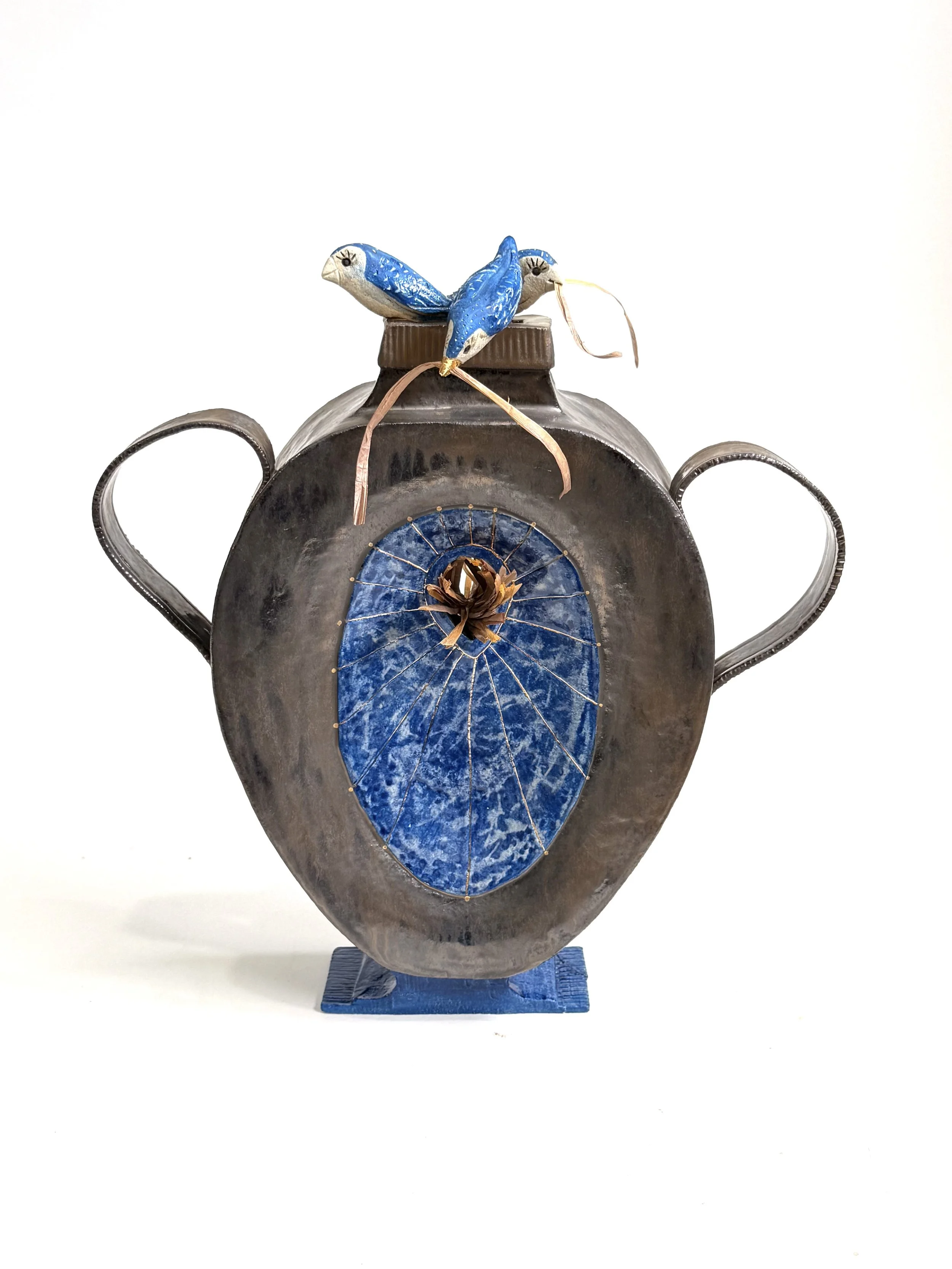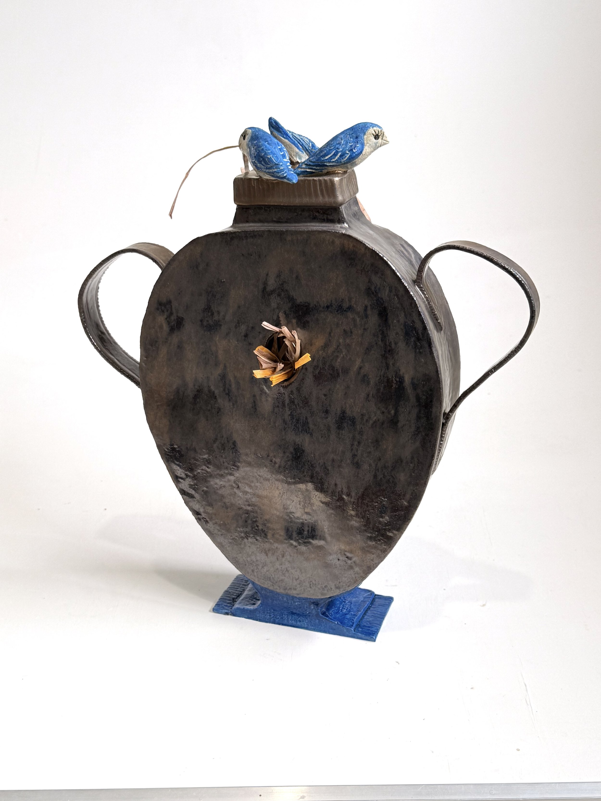 This tall ceramic vessel considers how perspective shapes what we notice and value. Three finches perch atop, two carrying bits of raffia grass, gestures of care that transform the vessel from simple form into home. One side is concave, decorated with cobalt and gold lustre surrounding a small hole holding a small nest; the other is flat and unadorned, broken only by the same piercing void. Within this opening rests a tiny nest, quietly built.